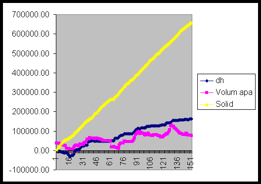Se poate observa ca variatia solidului deversat in iaz in raport cu axa x a zilelor din intervalul (01.10.2000 28.01.2001) este foarte bine determinata comparativ cu variatia volumului apei libere din iaz sau cu variatia cotei pe mira.